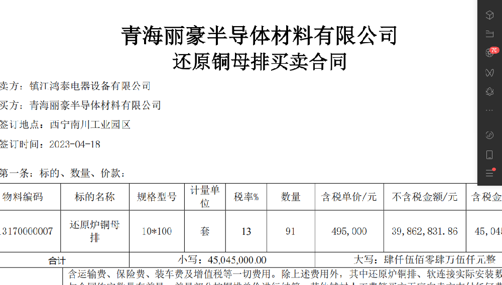 4月18日上午,我公司與青海麗豪半導(dǎo)體材料有限公司簽訂多晶硅還原銅母排合作協(xié)議,簽約雙方希望在技術(shù)研···